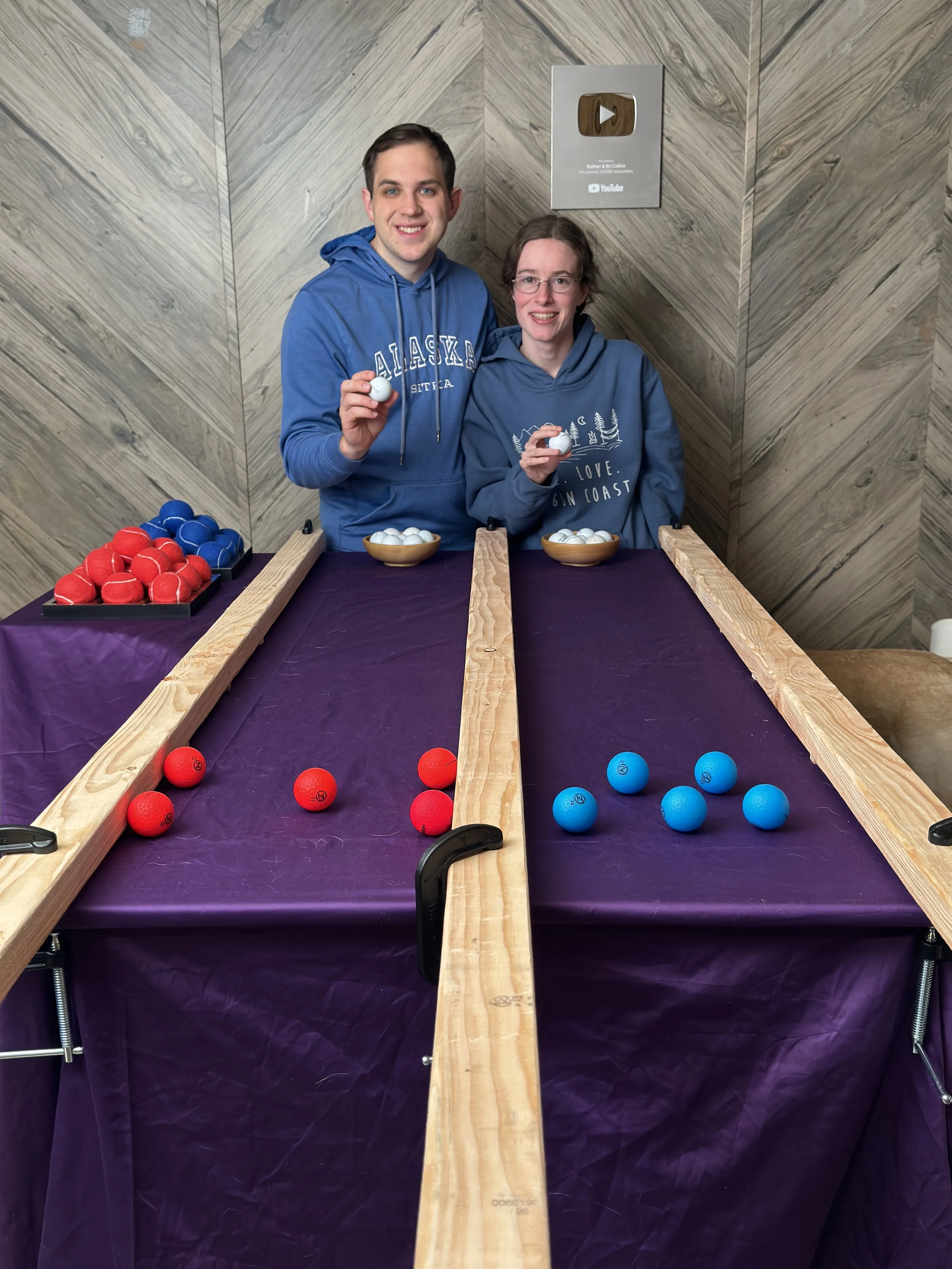 Instructions: Each player sets up five balls for the other player to try to knock off the edge. Players roll their balls to see who can knock them off first. The winner is the first player to knock off all the balls on their side. You can make your own house when the game ends in a draw. Feel free to try new ways to play this game to keep it fun for everyone. Bri and I would love to see your Carpet Ball Setup. If you post online and want us to see your setup, use the hashtag #CarpetBall or @BriNathanCollins.